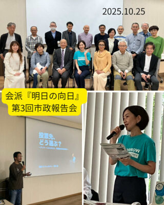 先日の市政報告会と懇親会にご参加くださった市民の方が、『死に逃げしたくない』とおっしゃいました。『死に逃げ』初めて耳にしたフレーズでした。彼女は成人した息子さんが2人いらっしゃるのですが、『息子たちに胸張っていい日本残したでしょ』と言って死ぬのが夢だと語られました。