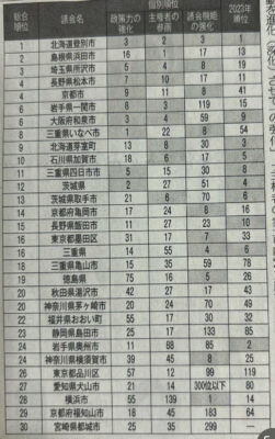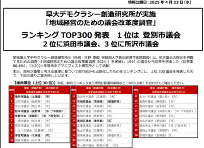 下記は早稲田大学マニュフェスト研究所の議会改革ランキングです。