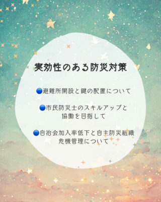 当初は違う項目について準備を進めてきましたが、まだ熟していなかったり、もう少し時間をおいてから質問した方が良い等など・・・行政の方々にもお話を伺いながら最終的に今回2項目にしました。いつも時間が全然足りないので今回は再質問もちゃんとできたらいいなと思います。